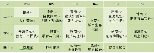 赠品:设计精美的营员手册、成长日记本、营帽、营牌。