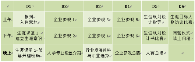 新高考背景下,考生根据自己的兴趣特长自主选择高考科目,其直接相关报考大学专业;走进企业内部,解密企业的运营模式和未来发展,聆听各行各业职场人分享,帮助学生树立生涯规划意识,掌握生涯规划的基本方法,引导营员科学合理地规划初高中学习、生活和实践,树立目标,提升学习动力。